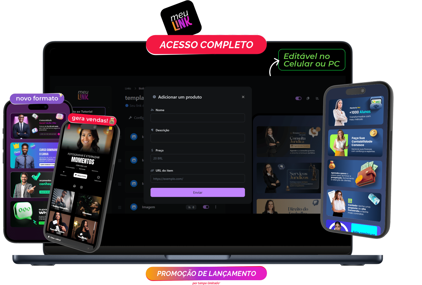 Com o MeuLink, você tem acesso a todos os templates em um só lugar, e sem precisar do Canva pra editar, é tudo simples e intuitivo pela plataforma e com direito a domínio próprio.